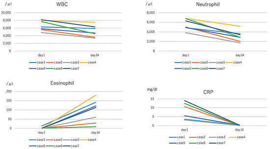 In the acute phase, white blood cell (WBC) and neutrophil were within the normal range, and C-reactive protein (CRP) were increased, but decreased at day 14 by the treatment of minocycline. The loss of eosinophil was detected in the acute stage but recovered to the normal range in all cases.