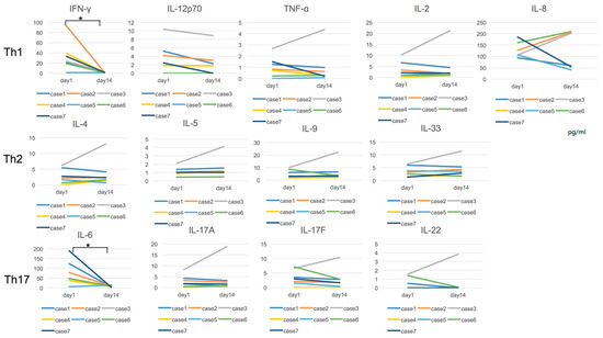 Cytokine concentration in the acute and recovery stages is shown. The increased IFN-γ and IL-6 levels were clearly decreased in the recovery stage in most of the cases. For Th1, Th2, and Th17 cytokines, except for IFN-γ and IL-6, cytokine levels were unchanged for 2 data points (days 1 and 14). Case 3 was exceptional and the cytokines, except for IFN-γ, IL-6, and IL-12p70, were elevated in the recovery stage. Statistical analysis was performed for the cytokine concentration between days 1 and 14, and significance was detected in IFN-γ and IL-6 levels (* p = 0.0111).