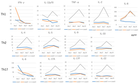 Cytokine concentrations were measured at 4 points in cases 1, 2, and 3. IFN-γ and IL-6 levels showed a peak on day 1, and reduced in a time-dependent manner. IL-5 and IL-9 are involved in the Th2 cytokine families, and the concentrations of those cytokines increased on day 7 and then decreased in the recovery stage. Th17 families except for IL-6 showed a slight peak on day 7. This tendency was not noticed for 2 data points (days 1 and 14).