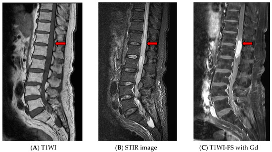 - Suzer, T.; Coskun, E.; Tahta, K.; Bayramoğglu, H.; Düzcan, E. Intramedullary spinal tuberculoma presenting as a conus tumor: A case report and review of the literature. Eur. Spine J. 1998, 7, 168–171. [Google Scholar] [CrossRef][Green Version]
