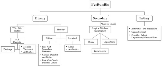 - Lipsky, P.E. Spontaneous peritonitis and systemic lupus erythematosus. Importance of accurate diagnosis of gram-positive bacterial infections. JAMA 1975, 232, 929–931. [Google Scholar] [CrossRef]
