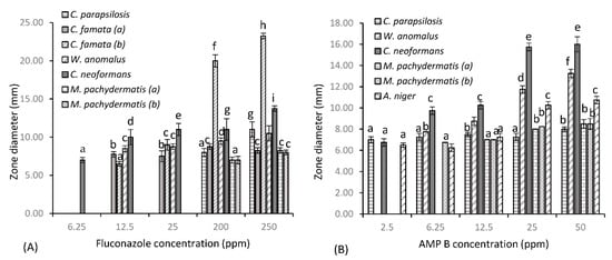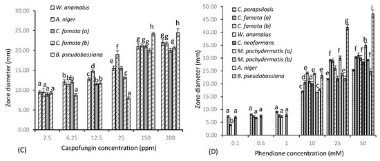Zones of diameter (mm) for fungal dermal isolates of canine disease for (A) fluconazole, (B) AMP B, (C) caspofungin and (D) test agent phendione (±S.D). Alphabetical letters denote significant difference at p < 0.05.