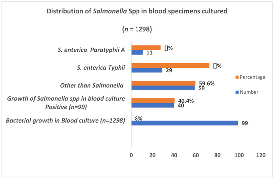 Among the total specimens processed, 7.6% (99/1298) showed visible growth of different microorganisms whereas 3.1% (40/1298) specimens were positive for the isolation of Salmonella spp. Of the total Salmonella isolates 72.5% (29/40) were S. enterica Typhi and 11 27.5% (11/40) were S. enterica Paratyphi A (Figure 1).
