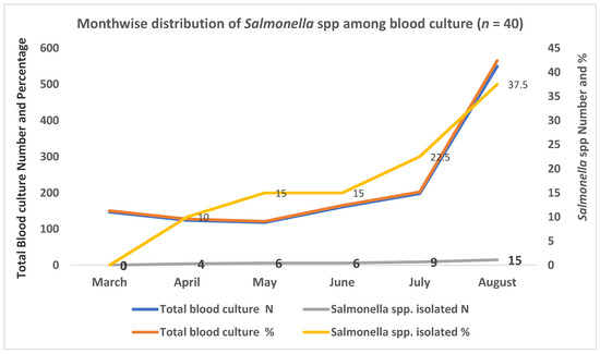 Monthwise isolation of Salmonella spp. from blood specimens.