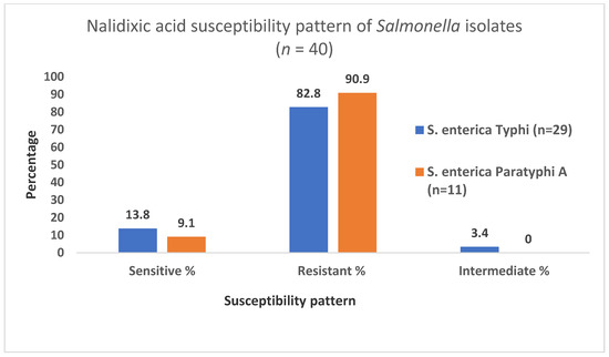 Nalidixic acid susceptibility pattern of S. enterica Typhi (n = 29) and S. enterica Paratyphi A (n = 11).