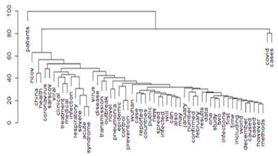 This analysis was conducted in a two-step process. Primarily, we applied text mining on COVID-19 text data of 2020 to find the different patterns. The COVID-19 dataset was extracted from Kaggle, which is an open research platform [26]. Text pre-processing is performed on the dataset. After the basic pre-processing and curation of textual data, the document term matrix (DTM) is constructed. As the DTM size is very large, the sparsity of the documents is removed and the final DTM is created. Once the DTM has been constructed, the term frequency-inverse document frequency (TF-IDF) is applied and the 310 most occurring words related to COVID-19 are extracted. To identify similar words from the textual data, hierarchical clustering is performed. With hierarchical clustering, similar, related words are identified and are plotted in the form of dendrogram representation, which is a tree-like structure in which branches at the same level represent similar words.