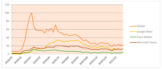 In this article, text mining is performed to analyses the most trending patterns of words and phrases during the pandemic, keeping education prospects as the focus. Moreover, data on internet search, social media [8], and Google analysis [9] have been used to mine information regarding the topic and analyze the leading aspects in terms of word search patterns and online platforms used throughout the pandemic. In this work, the authors have aimed to seek trend analysis on online platforms preferably used in the Indian education system. The authors have explored the Google trend on different learning platforms such as Zoom, WebEx, Google Meet, Microsoft, etc. The trend of using the top-rated online education platforms, namely Byju’s, Veduantu, Whitehat Junior, and Khan Academy for school students and Unacademic, Udemy, Syamam and Edx for UG and PG level courses were considered. Analysis and inspection of the Google trends of last year (15 February 2020 to 15 February 2021) on the different online platforms are presented to show how online platforms have grown due to the pandemic and its social and economic impact in the country. The increase in Google trends explicitly symbolizes the perception and work initiated, delivered and commissioned in various parts of the world [10,11].