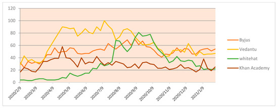 On the other hand, when learning platforms with an additional mentor and tutor facilities are looked at, Byju’s gained importance among the other players in the market. During the lockdown, Vedantu and Khan Academy also performed quite a remarkable job in promoting learning among university-going students, as represented in Figure 4. Whitehat Junior is also the most popular online application for school-going kids. They have invested manpower, resources and extended financial implication towards marketing. As seen from the trends, Whitehat Junior is on extensive marketing during May and June, thus seeing a huge hit on Google trends after that period. Swayam is a government initiation to educate UG- and PG-level course, showing growth in this area also and Udemy fee courses are the most searched on Google. Udemy has seen massive growth in the last year; their turnover in the year 2020 was $100 million.