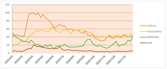 Additionally, the comparison of the online platforms that are providing education at UG- and PG-level courses reveals different notes on exhibiting various courses at the disposal of potential learners. While using keywords such as Udemy, Unacedamy, Swayam and Ed-X, Figure 5 highlights the number of hits as per the corresponding dates.