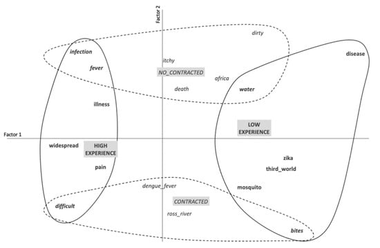 Drawing from the work of Piermattéo et al. [], and in line with the theoretical tenets of Deschamps [], the variables which contribute to the formation of the first factor were “High Experience” (i.e., older people) and the “Low Experience” (i.e., younger people) variables: CF (High Experience) = 0.48 + CF (Low Experience) = 0.50, thus a total contribution of 98% for the formation of factor 1. Factor 2 was formed by the contribution of the “Not contracted” and the “Contracted” variables: CF (Not contracted) = 0.50 + CF (Contracted) = 0.47, thus a total contribution of 97% for the formation of factor 2. Figure 1 of the correspondence factor analysis represents the socio-representational universes specific to each factor. Factor 1 (horizontal axis) is structured by contrasting people according to their experiences. People with a high level of experience (the oldest) evoke more frequently than others the elicitations: “fever”, “pain”, “infection”, which were directly linked to consequences of the disease. This result may be explained by the collective memory of previous mosquito-borne epidemics in Australia, or perhaps simply by the fact that, being older, this age group was more likely to have been exposed to the risk of MBDs. In contrast, the socio-representational universe of the people with a low level of experience (the youngest) portrays mosquito-borne diseases through descriptive elements such as “mosquito”, “bites” and “disease”. It is interesting to note that the frequency of the response “Zika” may be explained by the extensive media coverage of that particular epidemic at the time.