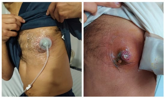 Upon physical examination, he was in no acute distress, and his skin exam was remarkable for an erythematous left periareolar nodule with swelling, warm, and purulent discharge (Figure 1), along with signs of systemic inflammatory response without clinical findings of sepsis organic dysfunction (Table 1). The patient started on therapy with intravenous clindamycin. However, he deteriorated due to the worsening of chronic kidney disease with the further requirement of renal replacement therapy.