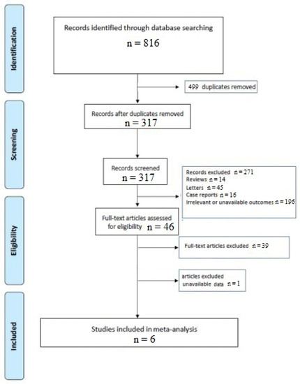 A total of 317 articles were retrieved after excluding duplicates. The initial screening excluded 271 articles because they did not meet the inclusion criteria, leaving 46 studies to assess for eligibility. After evaluation of the full-text articles, 39 were excluded for not meeting the inclusion criteria, and one article was excluded since we were not able to obtain the missing data, leaving 6 investigations suitable for the analysis (Figure 1) [5,10,11,12,13,14].