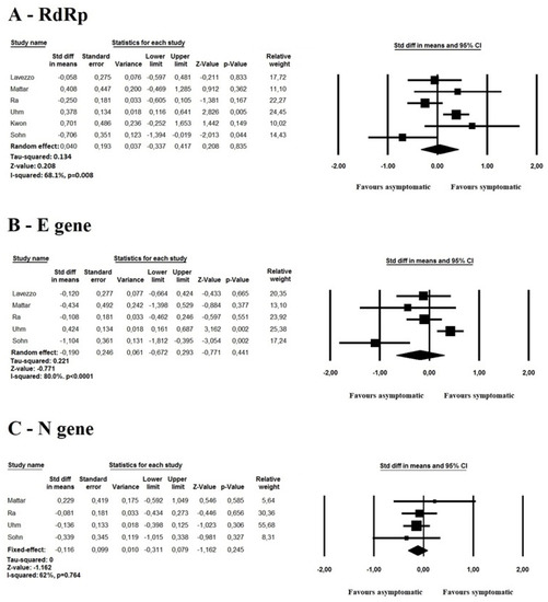 Meta-regression analysis evidenced that the differences in RdRP, E and N genes between asymptomatic and symptomatic patients were influenced by age (p = 0.03, p = 0.01 and p = 0.04 for RdRP, E and N genes, respectively) and female gender (p = 0.01, p = 0.002 and p = 0.01, for RdRP, E and N genes, respectively).