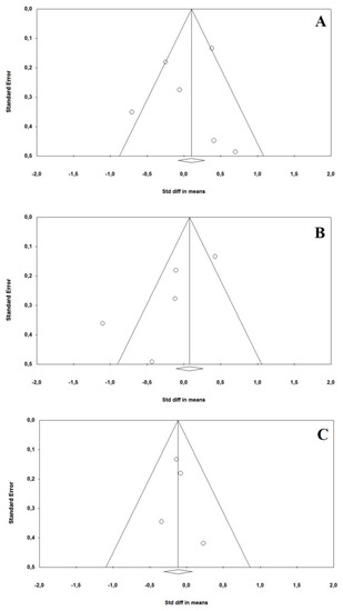 Continuous variables were expressed as mean and standard deviation (SD) or only as a mean if SDs were not provided in the original study. Data were analyzed using the Mantel–Haenszel method, and the standardized mean difference (SMD) and relative 95% confidence intervals (CI) were calculated. Statistical heterogeneity between groups was measured using the Higgins I2 statistic. Specifically, I2 = 0 indicated no heterogeneity, while we considered low, moderate and high degrees of heterogeneity based on the values of I2 of <25%, 25–75% and above 75%, respectively. Significant heterogeneity was assumed when the p-value was <0.1 or the I2 value was >50%. A random-effect model (DerSimonian–Laird) was used if the heterogeneity test was statistically significant or I2 > 50%; otherwise, a fixed-effect model was carried out. To evaluate potential bias, both Egger’s test and funnel plots were computed. To further appraise the impact of potential baseline confounders, a meta-regression analysis was conducted using the patients’ demographic characteristics (i.e., age and gender) as moderator variables. A p-value < 0.05 was considered statistically significant. All meta-analyses were conducted using Comprehensive Meta-Analysis software, version 3 (Biostat, Englewood, NJ, USA).