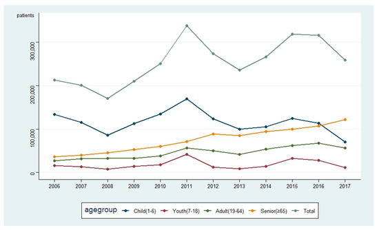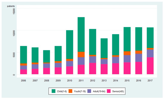 Figure 1 shows the number of discharged pneumonia patients each year. In 2006, the total number of discharged pneumonia patients was 6421: 3958 children, 490 adolescents, 909 adults, and 1064 seniors. In 2017, the total number of patients was 10,648: 4668 children, 349 adolescents, 1805 adults, and 3826 seniors. Compared to 2006, the total number of discharged pneumonia patients increased by 66%, and the increase was observed across all age groups (18% in children, 99% in adults, and 260% in seniors) except in adolescents (29% decrease). The number of discharged patients with pneumonia fluctuated each year. The number was lowest in 2008 at 5472 patients and highest in 2011 at 12,994 patients. The number of discharged pneumonia patients decreased after 2011 but started increasing again in 2014.