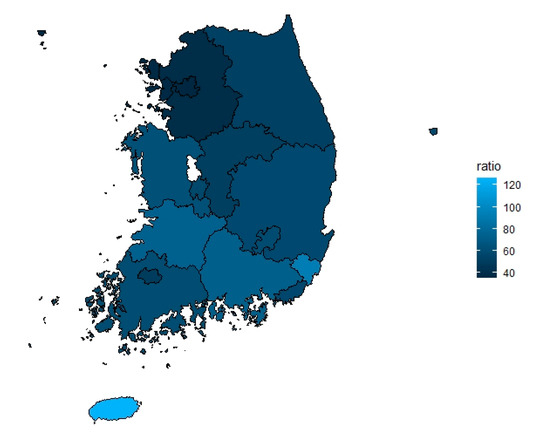 Weighted number of discharged pneumonia patients by regional population in South Korea (2017) (unit: per 10,000 person).