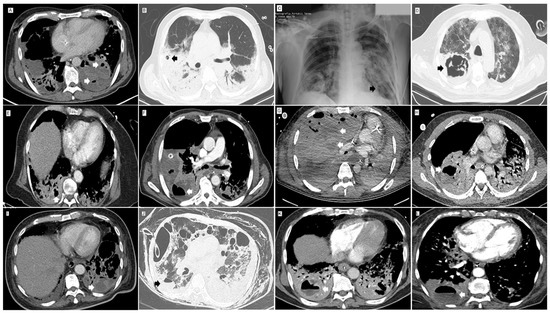 We conducted a retrospective study from 22 March 2020 to 15 June 2021 in two hospitals in Medellín, Colombia: Hospital Pablo Tobón Uribe (HPTU) and Clinica Cardio Vid (CCV). Both hospitals are private, tertiary care, referral hospitals (HPTU is 494 beds, with 102 critical care beds during the pandemic; CCV has 130 beds, with 36 intensive care unit (ICU) beds during the pandemic). All adult patients admitted to the ICU for respiratory failure related to confirmed COVID-19 (with a positive RT-PCR for SARS CoV-2), on invasive mechanical ventilation (IMV), with imaging or surgical findings documenting NP, were included. Diagnosis of NP was performed either by chest computed tomography (CT) documenting pneumonic consolidation with areas of low attenuation (necrosis), with or without pneumatocele(s), abscess(es), or cavitation(s) in the areas of consolidation [4], or by documentation of pulmonary necrosis, gangrene, or pneumatocele(s), with or without pneumatocele(s), abscess(es), or cavitation(s) in the areas of consolidation at the time of surgery. Data were collected on patient demographics, laboratory and radiologic studies, treatment, and outcomes. Categorical variables are presented as absolute frequencies and percentages. Continuous variables are presented as means and standard deviations or medians and interquartile ranges according to normal distribution. Analyses were performed using Stata/IC software, version 16 (StataCorp LLC., College Station, TX, USA). The two participating hospitals’ ethics committees approved this study.