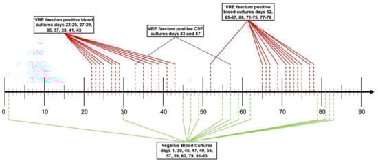 Timeline of VRE culture results from blood and CSF throughout the hospital admission.