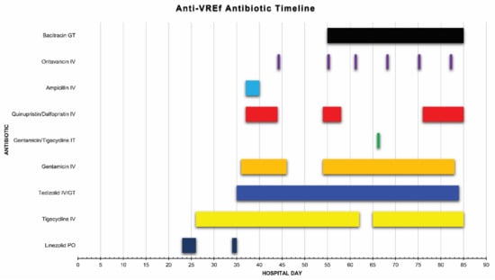 These difficulties are further augmented when attempting to treat VREf in less pervious body sites, such as the central nervous system (CNS) []. Enterococci are responsible for just 0.3–4% of reported bacterial meningitis cases, with VREf representing exceptionally few of these infections []. Notwithstanding pathogen-specific factors, the ability to reach and maintain therapeutic drug concentrations in the CNS is extremely problematic for most antimicrobial agents, including many of those active against VREf. This unfortunate combination of antimicrobial resistance, lack of clinical data and clinician experience, and the dearth of available effective treatment options presents a unique opportunity for collaboration between clinicians and researchers. These collaborations have been employed successfully, especially recently, against a variety of difficult-to-treat pathogens in complex clinical scenarios, highlighting the need for these types of partnerships to optimize therapy and achieve precision medicine [,,,,]. Herein, we present a case of an immunocompromised stem cell transplant patient with persistent, extremely drug resistant VREf bacteremia and meningitis treated in collaboration between clinicians and scientists via the use of unique therapeutic drug monitoring and in vitro pharmacokinetic/pharmacodynamic (PK/PD) analyses.