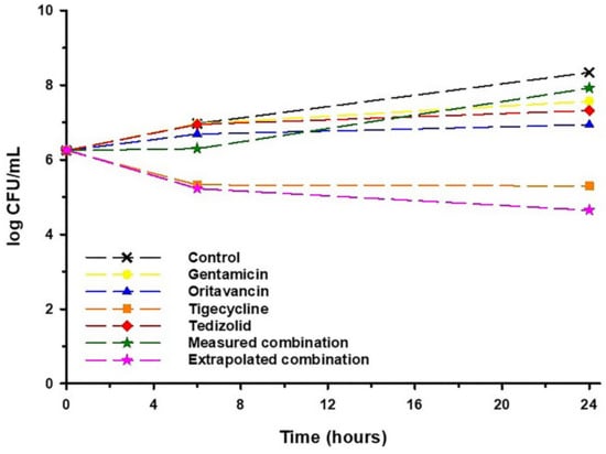 Time-kill experiments were performed in triplicate on the same day as previously described [] against the VREf isolate cultured from the CSF on hospital day 33. Analytical grade gentamicin, oritavancin, and tigecycline (Sigma-Aldrich, St. Louis, MO, USA), along with tedizolid, dalfopristin, and quinupristin (pristinamycin-IA) (MedChemExpress, Monmouth Junction, NJ, USA) were obtained commercially. Non-tissue culture-treated plates were used, and 0.002% polysorbate-80 was added to all oritavancin assays to prevent any loss of drug potency [,]. Antimicrobial agents selected for time-kill analyses alone and in combination were based on the in vitro susceptibility-guided regimen administered to the patient in response to the VREf-positive CSF and blood cultures on day 33 and 35, respectively. The first set of experiments tested each agent alone and in combination at the mean observed CSF concentration obtained from the day 57 lumbar puncture. Next, the 5 drugs were tested in combination at their respective extrapolated maximal CSF concentration as described.