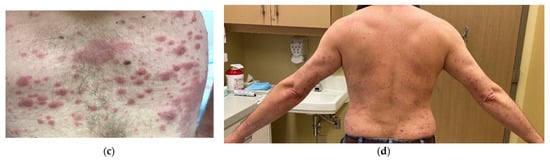 Skin lesions: at diagnosis (a) right arm, (b) thighs, (c) lower back, and post treatment (d) arms and back.