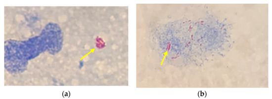 Acid-fast stain of slit skin smears of (a) left earlobe and (b) left elbow showing AFB-positive bacteria (yellow arrows).
