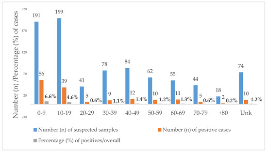 Toxocariasis was equally prevalent in females (18.8%, n = 66/351) and males (18.8%, n = 93/495). Regarding the age of the positives, it ranged from 1 to 85 years. Overall, 46.1% (390/846) of the suspected samples were requested from individuals under the age of 20. Additionally, 59.7% (95/159) of the positives were diagnosed in children younger than 20 years, i.e., 35.2% (56/159) in children aged 0–9 years and 24.5% (39/159) in teenagers aged 10–19 years. Positivity was higher in the age groups below 20 years with a statistically significant difference between the age group 0–9 years (29.3%) and the age group 10–19 years (19.6%; p < 0.012) (Figure 2).