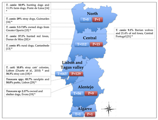 Distribution of the tested (T) and positive (P) human samples for Toxocara spp., received at the Institute of Hygiene and Tropical Medicine (IHMT) from 2010 to 2020, divided by its provenance according to the five regional health units of continental Portugal. T = number of tested samples (nine samples are not shown in the figure as provenance is unknown); P = number of positive samples (four positives are not shown in the figure as provenance is unknown). The side text boxes show the epidemiological studies conducted to assess Toxocara prevalence in soil and in animal species in Portugal. * Samples tested by coprological analysis; # Samples tested by parasitological necropsy.