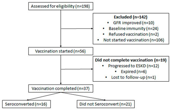 A total of 198 CKD patients were identified during the study period (Figure 1). Of these, 10 were eliminated from further analysis, since their GFR was higher than 30 mL/min/1.73 m2. Twenty-four patients had a positive hepatitis B surface antibody at baseline, while two patients refused vaccination. Out of the remaining 162 eligible patients, 56 patients started their immunization schedule, while the vaccination series was not started on 106. These details are shown in Table 1.