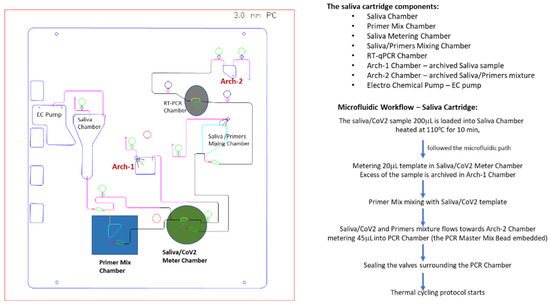 Schematic illustration of SARS-CoV-2 RT-qPCR cartridge layout. A saliva cartridge is composed of several chambers (saliva chamber, primer mix chamber, saliva/SARS-CoV-2 meter chamber, saliva/primers mixing chamber, RT-PCR chamber, and archive chambers), connecting channels, valves, and pumps. Each functional chamber is labeled corresponding to its content. The saliva cartridge microfluidic workflow and volumes are outlined and indicated.