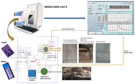 The MiDAS system was adapted for SARS-CoV-2 test used micromachined cartridges which will be optimized for better reproducibility by scale-up manufacturing and injection molding. Although we demonstrated the sensitivity and accuracy of direct detection of SARS-CoV-2 from saliva samples spiked with known copy number of SARS-CoV-2 RNA or virions, further tests with a larger set of clinical samples is also necessary to validate the system for clinical application. With the scalability of this platform, an effort for on-cartridge simultaneous processing of higher throughput of specimen in multiple cartridges is in progress.