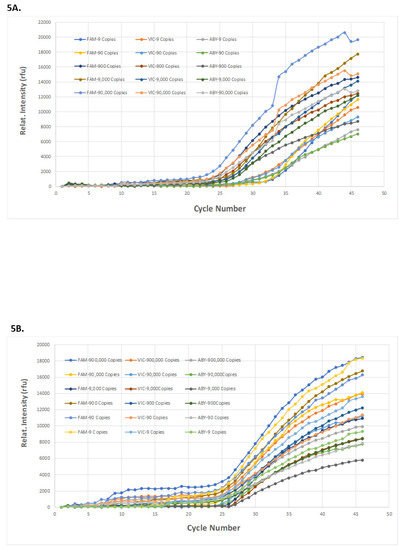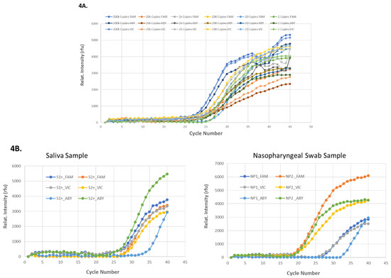 As outlined in Figure 2, a complete on-cartridge assay on-MiDAS, with “saliva-in and result-out” was demonstrated, detecting SARS-CoV-2 from the saliva sample spiked with either purified SARS-CoV-2 RNA or SARS-CoV-2 virions. One Qscript Lyo 1-Step Multiplex RT-qPCR bead was embedded into the cartridge PCR chamber during cartridge assembly. The well-mixed saliva/CoV2 RNA/primers mixture was directed toward Arch-2 chamber with 45 µL metered into the PCR chamber. The on-cartridge RT-qPCR started, with real-time monitoring after the valves surrounding the PCR chamber were closed. Different concentrations of SARS-CoV2 RNA or virion spiked in saliva were examined for on-cartridge detection. The on-cartridge detection sensitivity and multiplexity were presented in Figure 5A with purified 2019-nCoV-2 Plasmid-RNA and Figure 5B with γ-irradiated SARS-CoV-2 Virions. Triplex PCR amplification curves were generated from a template concentration of 900,000 copies to nine copies of SARS-CoV2 RNA and virions. Sample retrieved from the cartridge Arch-2 chamber, which contains on-cartridge mixed saliva and primers, were checked on a benchtop real-time PCR system to further evaluate the on-cartridge mixing and multiplexing PCR (Figure S5). Comparing the on-cartridge RT-qPCR amplification result (Figure S5A) with the RT-qPCR result from the Arch-2 sample retrieved from the same cartridge (Figure S5B), the amplification intensity obtained from the Arch-2 sample was often seen to be attenuated. This can be attributed to a time lag between retrieving the sample from the Arch-2 chamber and running the sample as an RT-qPCR control. The efficacy of PCR reagents in the mixture retrieved from the cartridge would decrease before the RT-qPCR control was performed. The Qscript Lyo 1-Step Multiplex RT-qPCR bead was used in both on-cartridge and in-tube detections.