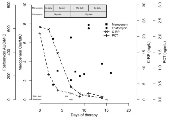 Temporal trends of pharmacokinetic/pharmacodynamic indices of meropenem (Css/MIC) and fosfomycin (AUC24h/MIC), as well as a reduction in inflammatory biomarkers (C-reactive protein and procalcitonin). AUC24h, 24 h area under the plasma concentration–time curve; Css, steady-state concentration; C-RP, C-reactive protein; PCT, procalcitonin; and MIC, minimum inhibitory concentration.
