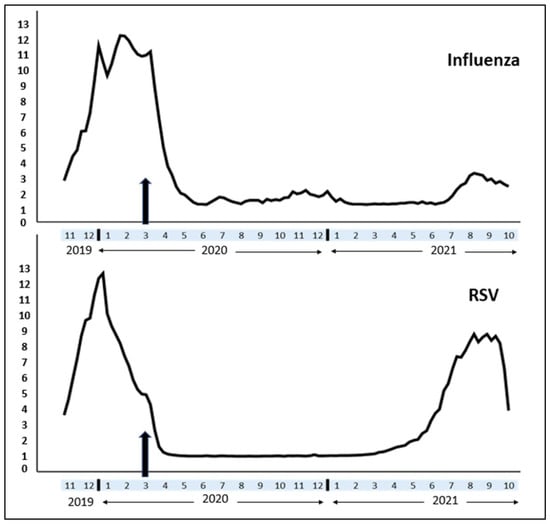 - RSV National Trends. Available online: https://www.cdc.gov/surveillance/nrevss/images/trend_images/RSV124PP_Nat.htm (accessed on 31 January 2022).