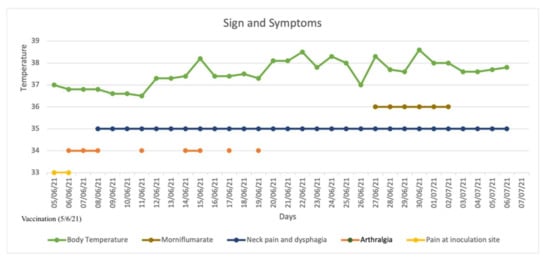 Signs and symptoms from the day of vaccination (5/6/21); patient self-prescribed morniflumate 350 mg/day. Fever and neck pain disappeared on the 2nd day after hospitalization. Patient was hospitalized on 5/7/21 and discharged on 10/07/21.