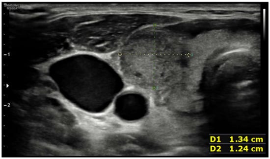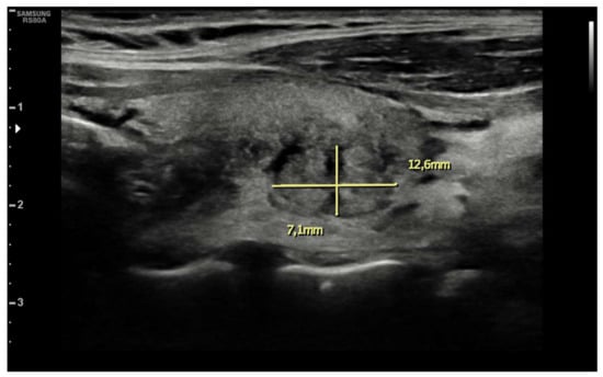 Ten days after vaccine inoculation, the patient performed a nasal swab for SARS-CoV-2 and a second one, namely a multiplex-PCR for respiratory pathogens, both of which resulted in negative. On the next day, the patient performed blood tests, which showed a systemic inflammatory response; White blood cell count (WBC) was 10,800 cells/µL (8200 neutrophils; 1650 lymphocytes), hemoglobin 11.2 g/dL, platelet count 455,000 cells/µL, ESR 88 mm/h, and C-reactive protein (CRP) 75 mg/L. Serum protein electrophoresis showed a non-specific inflammatory picture, with a mild increase in gamma and alpha-2 globulins). ELISA test for EBV, Toxoplasma, CMV, showed an isolated positivity for CMV IgG, which were considered to be non-specific. During the hospitalization, while waiting for blood test results and for an endocrinological consult, patient tachycardia was managed with propranolol 40 mg tris in die (t.i.d.). Blood tests performed in-hospital showed: CRP 78 mg/L, ESR 86 mm/h, Hb 8.7 g/dL, no alteration in WBC or RBC number, no alteration in hepatic or renal function. An abdominal ultrasound showed no pathological findings. A thyroid morphological evaluation was performed via ultrasonography. An appearance typically seen in chronic or sub-acute thyroiditis was observed. Thyroid was increased in dimensions with lobular borders and a micronodular pattern, i.e., hypoechoic nodules with hyperechoic fibrotic shoots. More specifically, two pseudo-nodules were found, the biggest on the left lobe (7 mm × 12.6 mm—Figure 2), and on the right lobe (12 mm × 13 mm—Figure 3).