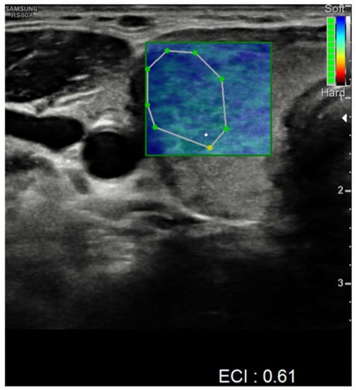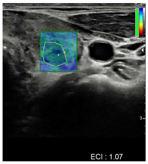 Nevertheless, nodules showed no alteration in color-Doppler sampling or in stiffness analysis. The elasticity contrast index (ECI) was computed, resulting in low values. This is a finding compatible with non-malignant nodules (Figure 4 and Figure 5).