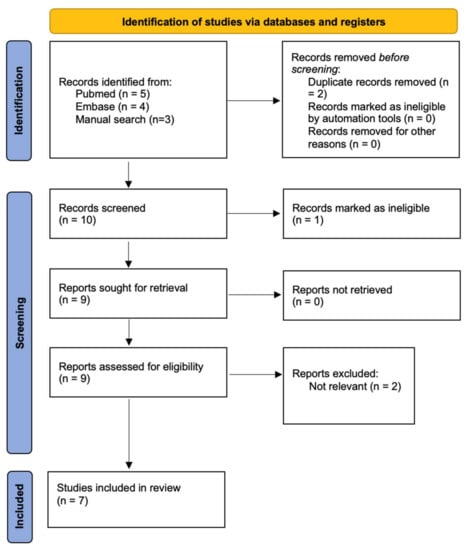 A total of 9 studies were found through systematic database searching and 3 via a manual search of referenced articles. Duplicate records were removed, and the remaining 10 studies were retrieved and assessed for relevance and validity, leaving 7 studies for inclusion. A total of 10 cases were described. Records retrieval and selection process can be found in Figure 6.