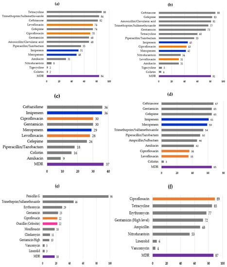 Resistance rates (%) to antimicrobials in six major species (genus) of bacteria ((a) Escherichia coli, (b) Klebsiella sp., (c) Pseudomonas sp., (d) Acinetobacter sp., (e) Staphylococcus aureus, (f) Enterococcus sp.) isolated in Yangon Children’s Hospital in 2020. The bars representing rates for quinolones, carbapenems, and oxacillin (cefoxitin) are shown in orange, blue, and pink, respectively. MDR represents multiple drug resistance, which was defined as resistance to three or more antimicrobials of different classes. For (b,c), MDR rates of K. pneumoniae and P. aeruginosa are shown, respectively. “Gentamicin—high” (e) and “Gentamicin (high level)” (f) represent MIC of ≥500 μg/mL. To assign resistance to tigecycline, interpretive criteria for Enterobacterales (MIC of 8 μg/mL or higher) defined by the U.S. Food and Drug Administration was employed.
