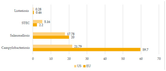 Selected livestock-associated zoonoses: comparison of the number of cases in United States (US) and European Union (EU) in 2019 (cases per 100,000 population). Created based on data from [5,7].