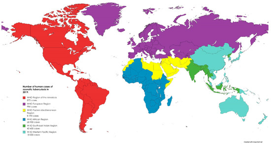 The global distribution of zoonotic tuberculosis human cases in 2019. Created based on data from [47].