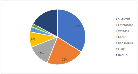The organisms most commonly isolated were S. aureus (34% of cases), followed by Enterococci (22%), Streptococcus viridans (13%) and CoNS (9%). We also recorded one fungal IE case due to Candida tropicalis. The number of blood-culture-negative IEs (BCNIEs) was 11 (16.2%) (Figure 1). In terms of valves, the aortic valve was involved in 44%, the mitral valve in 25% and the tricuspid value in 15% of patients; more than one valve was affected in the last 16% of cases. The modified Duke criteria for the IE diagnosis resulted in a 94% diagnosis accuracy, considering definite (n = 47; 69%) and probable (n = 17; 25%) IE cases. Embolic complications occurred in 27 (39.6%) patients, with an extra-cerebral involvement in 20 cases (29.3%). Among these, seven, eight and five patients had an isolated splenic embolization, a pulmonary embolization, and a miscellaneous embolism, respectively (Table 3).