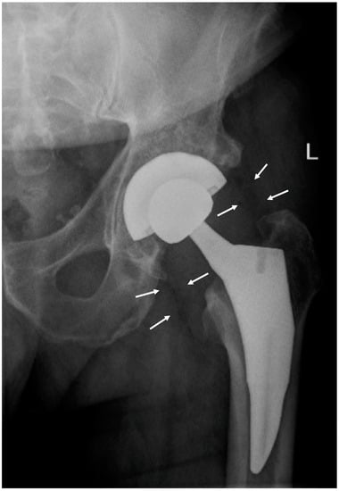 A hip radiograph demonstrating periprosthetic gas in soft tissue. Two foci of gas are outlined by white arrows; the largest focus of gas is at the lateral aspect of the hip. The patient underwent a total left hip replacement eight days prior to the onset of tetanus symptoms and demonstrated no other evidence of deep or superficial injury.