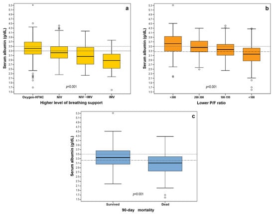 Differences among study subgroups according to serum albumin level at hospital admission: (a) higher level of breathing support; (b) lower P/F ratio; and (c) 90-day mortality. Black horizontal line inside the boxes: median. Boxes height: IQR. Whiskers: 1.5 × IQR. Small circles: outliers. Stars: extreme values. Small-dashed lines: serum albumin laboratory normal threshold. Large-dashed lines: serum albumin best cutoff values. HFNC: high-flow nasal cannulae. NIV: non-invasive mechanical ventilation. IMV: invasive mechanical ventilation.