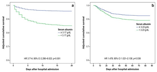- Yin, M.; Si, L.; Qin, W.; Li, C.; Zhang, J.; Yang, H.; Han, H.; Zhang, F.; Ding, S.; Zhou, M.; et al. Predictive Value of Serum Albumin Level for the Prognosis of Severe Sepsis Without Exogenous Human Albumin Administration: A Prospective Cohort Study. J. Intensive Care Med. 2018, 33, 687–694. [Google Scholar] [CrossRef] [PubMed]