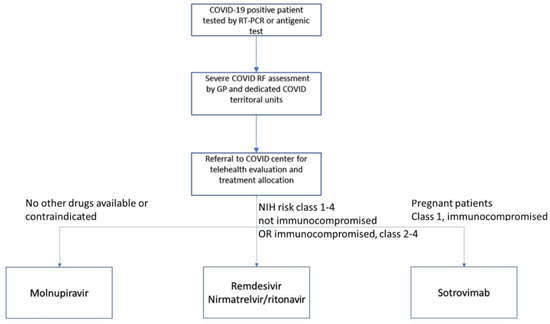 Antivirals have also recently found a place as early treatment option. Remdesivir (RMD), an intravenous direct-acting adenine nucleotide prodrug RNA polymerase RNA-dependent inhibitor, was conceived as a treatment for Ebola and shown to be active against SARS-CoV-2. An early five-day course of RMD reduces morbidity and mortality in inpatients [1,2]. Treatment after seven days from symptoms’ onset showed no difference in morbidity and mortality outcomes [1]. Using a three-day course of RMD in outpatients reduced the risk of hospitalization or death by 87% [2,13]. However, the need for multiple doses and kidney and liver function evaluation leads to logistical constraints [13]. Therefore, an ideal treatment option for early COVID-19 should have these characteristics (1) orally administered, (2) dispensable by general practitioners (GPs) (3) low pill burden with minor interactions. Two oral treatments are available: nirmatrelvir/ritonavir (a protease inhibitor) and molnupiravir (a prodrug of the synthetic nucleoside derivative N4-hydroxycytidine) [2,14]. The latter has success rate inferior to mAbs (30% hospitalization reduction) [2,14] and requires eight pills/day. The former has a lower pill burden and had results comparable to mAbs (88% reduction in hospitalizations/death), but is burdened by relevant drug interaction issues, mainly related to ritonavir [2,15]. Here, we present an account of the challenges faced in the first month of increased outpatient treatment at a tertiary care center located in Florence, Italy.