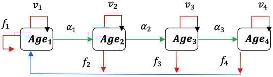 Let us consider a population with four age classes that is (0, 19), (20, 39), (40, 59), and (≥60), the first two only being fertile with non-zero fertility rates f1 and f2, and if a disease like an epidemic outbreak concerning all the age classes occurs adding to the natural mortality rate of each of the three first classes a fatality rate, the sum of the natural and disease dependent mortality, denoted by µj = 1 − αj. We present in Figure 1 the flow chart illustrating the epidemiology ageing model.