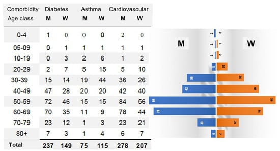 Let us consider now the distribution of age classes of the subpopulation of infected patients presenting the most frequent comorbidity, i.e., cardiovascular pathologies (cf. Figure 2) and where males are most numerous than females [].