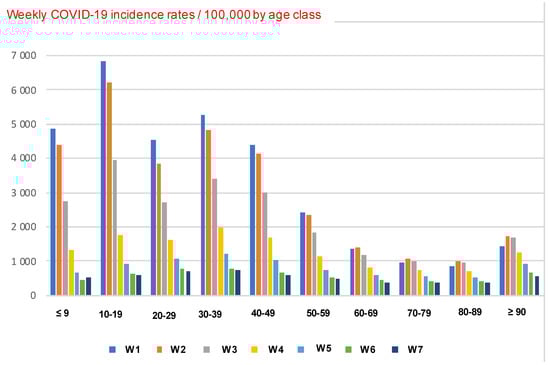 Histogram of weekly COVID-19 incidence rates/age class in France during 10 weeks from the 17 January 2022. The global daily incidence rate on 17 January 2022 was equal to 3264/100,000 (taking into account the age class sizes) ([]).