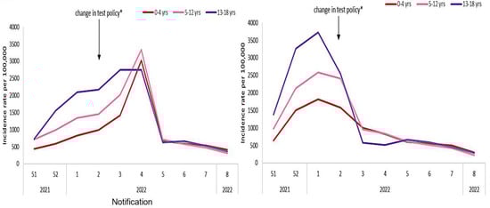 Ireland weekly age-specific incidence rates of confirmed COVID-19 cases per 100,000 population among children aged 0–18 years by notification (left) and from Epiet data (right) from week 51 in 2021 to week 8 in 2022 (after []). Asterisked notation * indicates the date of change of policy.